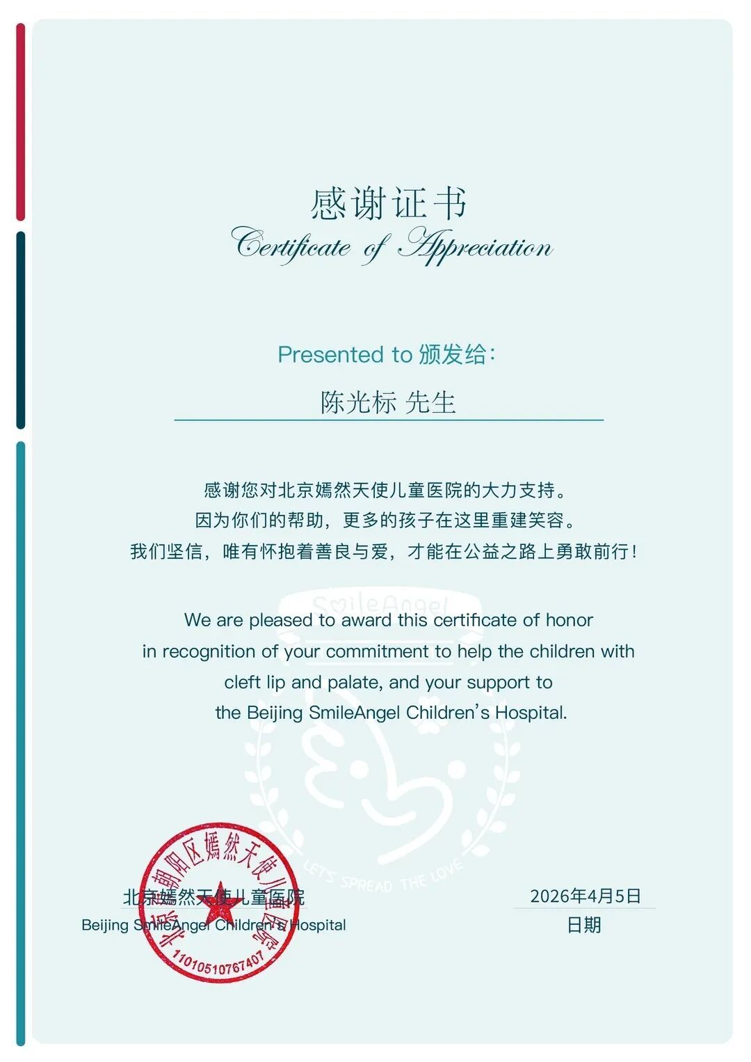 4月7日,“北京嫣然天使儿童医院体检中心”官方账号发布颁发给陈光标的感谢证书。